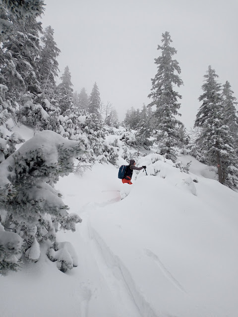 ... hier fuhren wir nun durch den staubenden Schnee hinunter